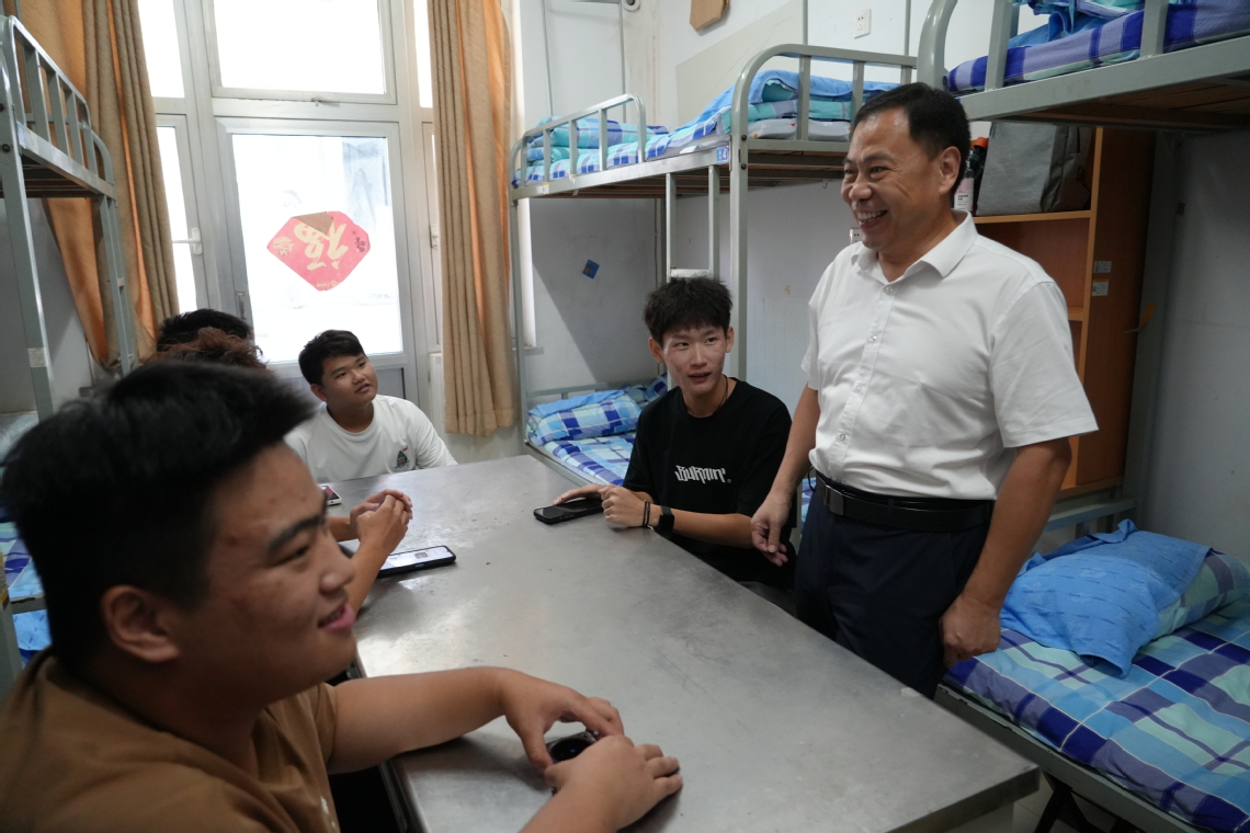 在學(xué)生宿舍,張建臣與新生同學(xué)們聊家常,詢問(wèn)大家生活習(xí)慣以及入校后的適應(yīng)情況,鼓勵(lì)他們盡快適應(yīng)集體生活,要在山電這個(gè)大家庭里互幫互助、共同進(jìn)步。