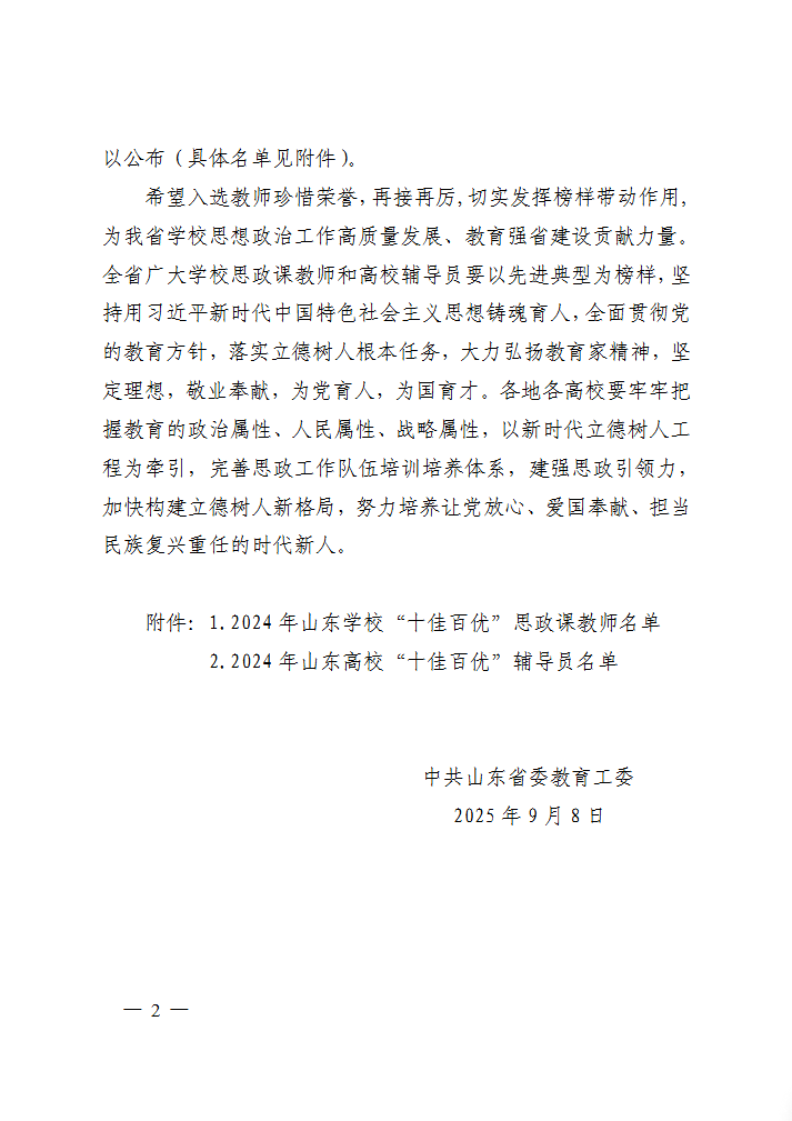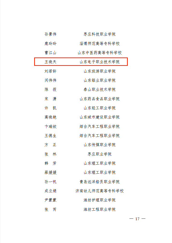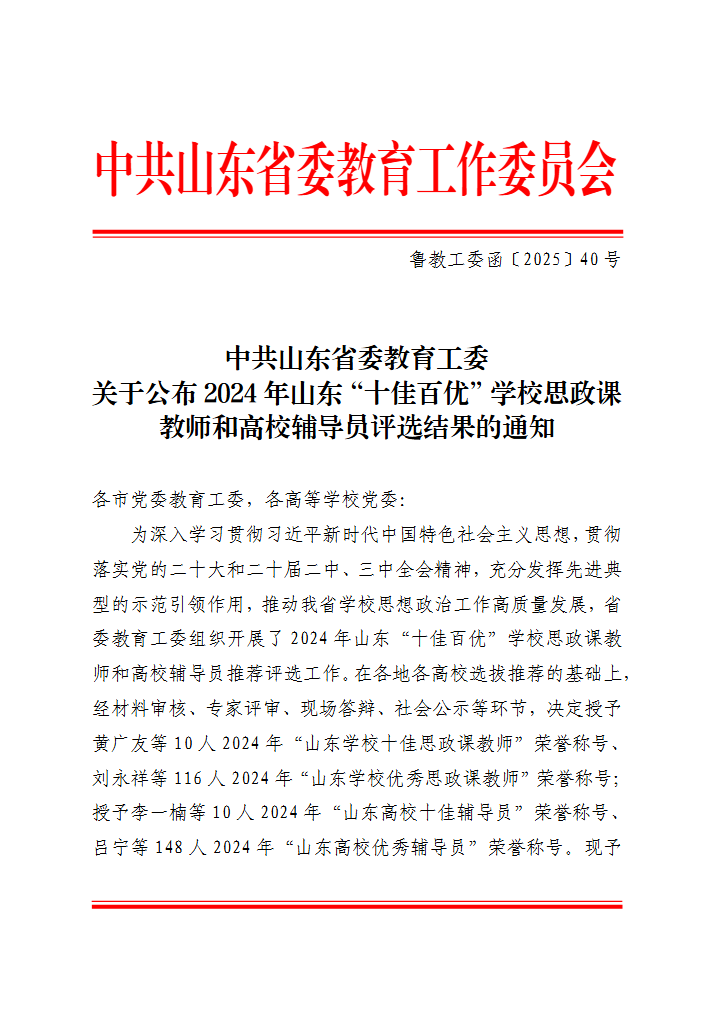 近日,中共山東省委教育工委公布了2024年度“山東學(xué)校思政課教師年度人物”“山東高校輔導(dǎo)員年度人物”評選結(jié)果,我校智能制造工程系黨總支副書記王曉天老師榮獲2024年“山東高校優(yōu)秀輔導(dǎo)員”。
