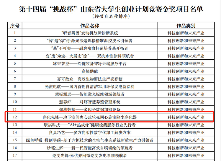 近日,由共青團山東省委、山東省科學技術協(xié)會、山東省教育廳、山東省學生聯(lián)合會共同主辦的第十四屆建設銀行“挑戰(zhàn)杯”山東省大學生創(chuàng)業(yè)計劃競賽在煙臺落下帷幕。經(jīng)過激烈角逐,我校取得了1金4銀9銅的優(yōu)異成績。徐榕辰、孫英豪等十位同學的作品《凈化先鋒—地下空間離心式輪殼同心旋流除塵凈化器》榮獲“金獎”。