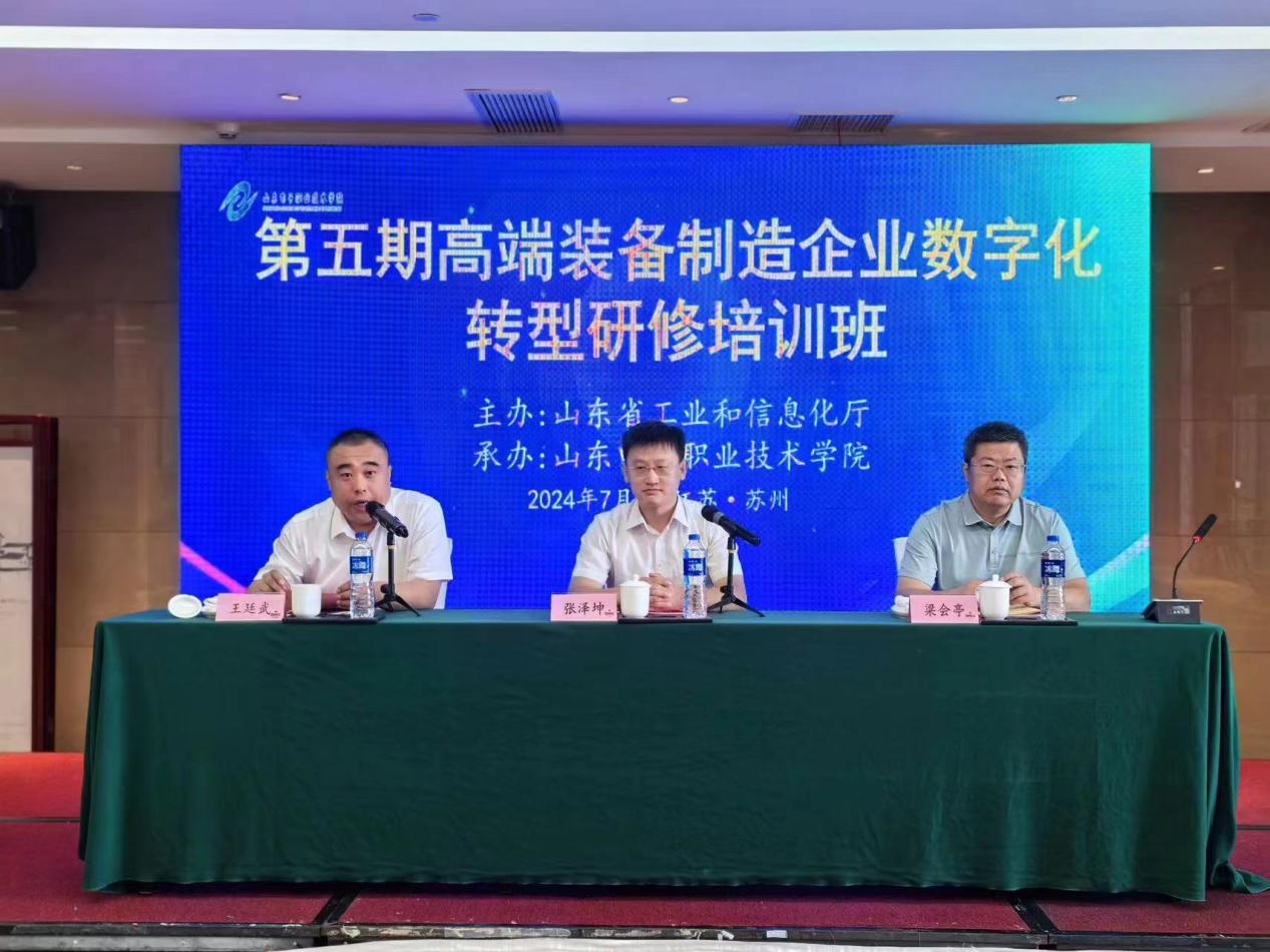 為加快推進裝備制造業(yè)企業(yè)數(shù)字化轉型,7月2日至5日,由山東省工業(yè)和信息化廳主辦,山東電子職業(yè)技術學院承辦的第五期高端裝備制造企業(yè)數(shù)字化轉型培訓班在蘇州舉辦。來自棗莊、濟寧、臨沂、日照、青島、煙臺、威海、濰坊等8個地市的裝備制造類企業(yè)及區(qū)縣工業(yè)和信息化局相關人員共90余人參加。省工業(yè)和信息化廳裝備產(chǎn)業(yè)處副處長張澤坤,學校黨委委員、副院長梁會亭出席開班儀式并致辭。