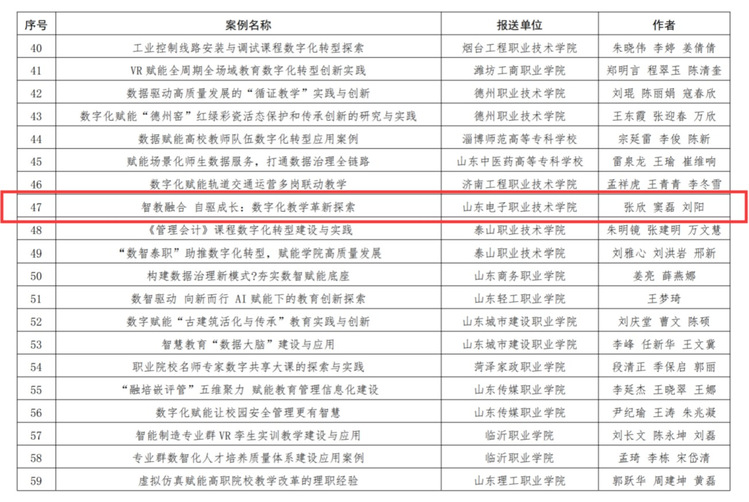 近日,山東省教育廳發(fā)布《關(guān)于公布2024年數(shù)字化賦能教育管理信息化建設(shè)與應(yīng)用典型案例評(píng)選結(jié)果的通知》(魯教科函〔2024〕33號(hào)),我校選送的《智教融合自驅(qū)成長(zhǎng):數(shù)字化教學(xué)革新探索》案例獲評(píng)優(yōu)秀典型案例。