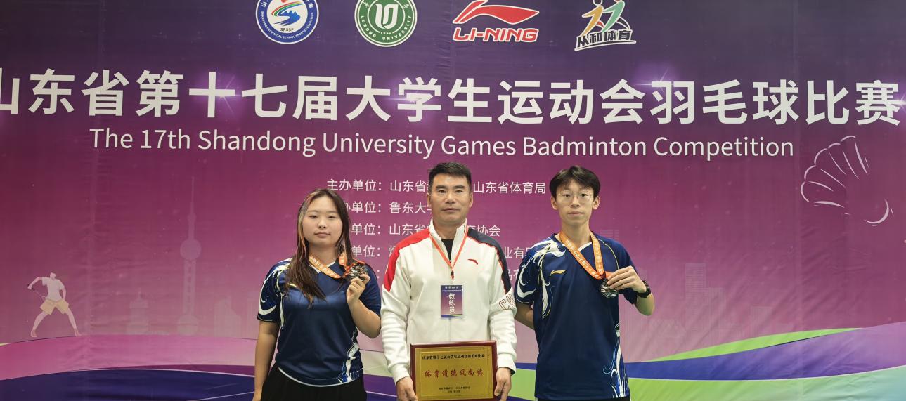 11月12日,山東省第十七屆大學(xué)生運(yùn)動(dòng)會(huì)羽毛球比賽(乙組)成績揭曉,我校數(shù)字商務(wù)學(xué)院學(xué)生張慶松、滕子躍在基礎(chǔ)教學(xué)部體育組教練團(tuán)隊(duì)組織訓(xùn)練下,由王清華老師帶隊(duì)并現(xiàn)場指導(dǎo),歷經(jīng)六天賽程的激烈比拼,取得混雙比賽銅牌、男子單打第四的好成績。學(xué)校代表隊(duì)喜獲“體育道德風(fēng)尚獎(jiǎng)”!