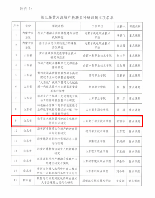 近日,黃河流域產(chǎn)教聯(lián)盟公布了第三屆黃河流域產(chǎn)教聯(lián)盟系列活動評選結(jié)果,我校李敏團隊立項優(yōu)秀教師教學創(chuàng)新團隊,張雪華老師負責的《數(shù)字技術(shù)賦能黃河流域文化保護傳承實證研究》立項重點課題。