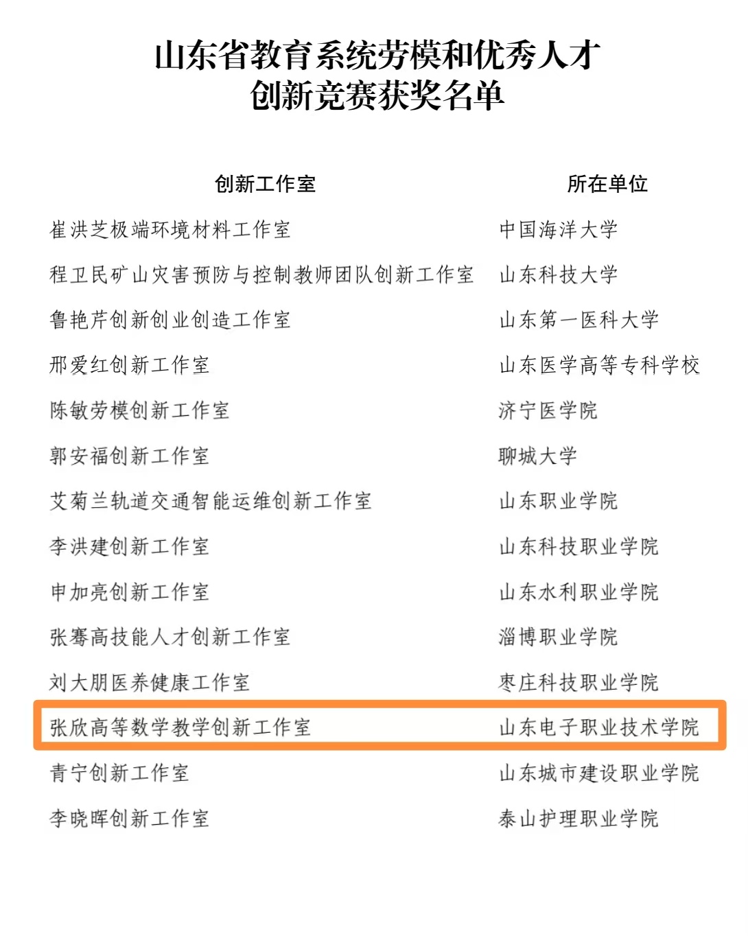 11月26日,山東省教育工會委員會公布山東省教育系統(tǒng)勞模和優(yōu)秀人才創(chuàng)新競賽獲獎名單,省內(nèi)14所高校獲獎,山東電子職業(yè)技術(shù)學(xué)院張欣高等數(shù)學(xué)教學(xué)創(chuàng)新工作室(以下簡稱創(chuàng)新工作室)位列其中。
