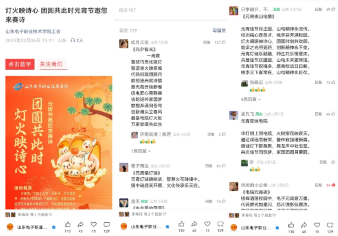 當(dāng)數(shù)字科技邂逅千年詩韻,會碰撞出怎樣的文化火花?元宵節(jié)期間,燈火映詩心 團(tuán)圓共此時主題賽詩活動在學(xué)校新媒體平臺火熱開展,通過云端賽詩會的創(chuàng)新形式,讓傳統(tǒng)文化煥發(fā)時代光彩,在教職工群體中掀起以詩會友慶團(tuán)圓的文化熱潮。