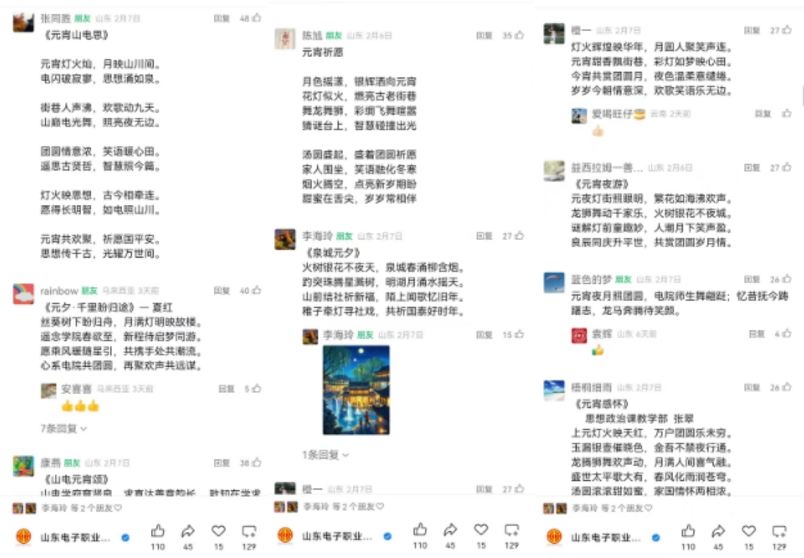 作為活動承辦方,數(shù)字商務(wù)學(xué)院分工會巧借新媒體傳播優(yōu)勢,依托學(xué)校工會微信公眾號搭建云端詩社,創(chuàng)新設(shè)置了“即興創(chuàng)作+互動點(diǎn)贊”的數(shù)字化參與模式。教職工們熱情高漲,或即興揮毫創(chuàng)作原創(chuàng)詩詞,或化身當(dāng)代推敲客字斟句酌,將家國情懷、教育理想、佳節(jié)愿景融入平仄韻律。據(jù)統(tǒng)計(jì),活動期間累計(jì)收到詩詞作品120余首,留言區(qū)互動量達(dá)上千人次,精選作品單篇最高獲贊達(dá)127次。這場別開生面的“云端詩會”實(shí)現(xiàn)三重文化效應(yīng):一是以“賽”促創(chuàng),激發(fā)了教職工對詩詞的熱愛和創(chuàng)作熱情;二是以“云’為媒,構(gòu)建了傳統(tǒng)文化傳承新場景;三是以“情”聚力,通過共賞詩韻增強(qiáng)集體認(rèn)同。正如參賽教師所言:在平仄對仗中觸摸文化基因,于互動點(diǎn)贊間感受同事情誼,這個元宵節(jié)過得格外風(fēng)雅。