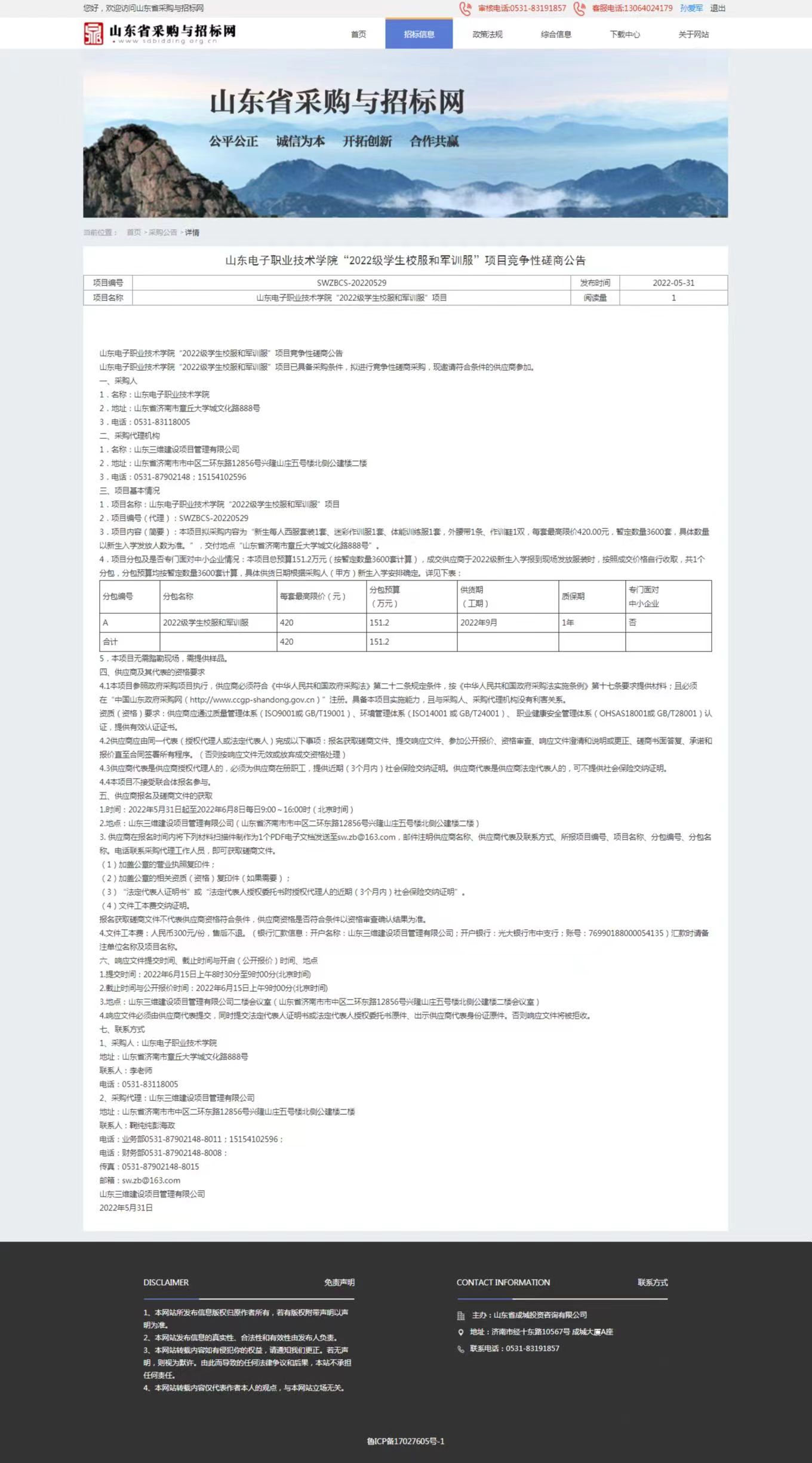 山東電子職業(yè)技術(shù)學(xué)院“2022級(jí)學(xué)生校服和軍訓(xùn)服”項(xiàng)目已經(jīng)學(xué)校批準(zhǔn),具備采購條件,并委托山東三維建設(shè)項(xiàng)目管理有限公司組織競爭性磋商采購。詳見:采購公告詳情頁-山東省采購與招標(biāo)網(wǎng) (sdbidding.org.cn)
