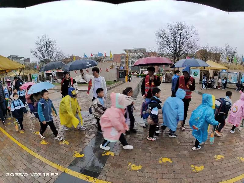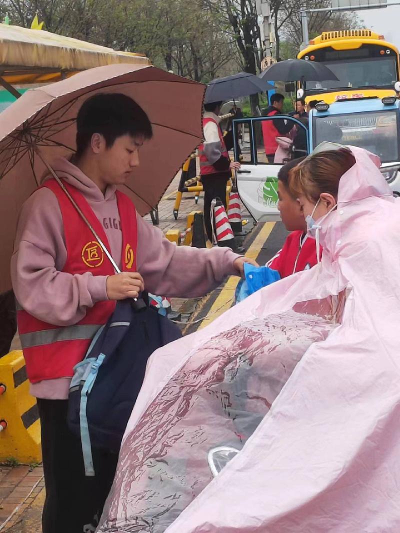 志愿者們活躍在道路兩旁,有的指揮著來往的車輛,疏導校門口交通。有的攙扶著小學生從校車上走下。有的為小學生打傘、收傘,拂去身上的雨水,幫助他們背上書包,大手牽小手,一路護送安全進入校園。大家盡心盡力、熱情奉獻,一趟接一趟,共同為孩子們撐起一把“愛心傘”,換來的是一張張笑靨如花的臉,每一幕都感動著過往的每一個行人。