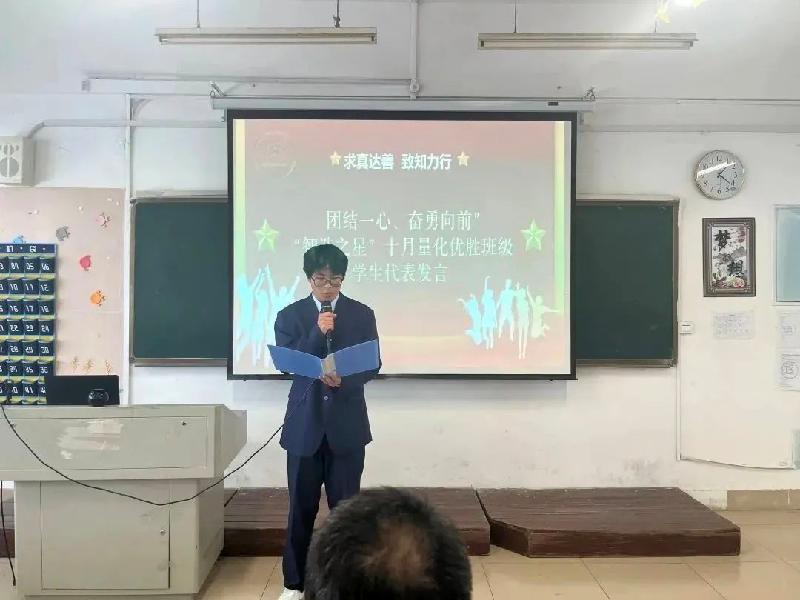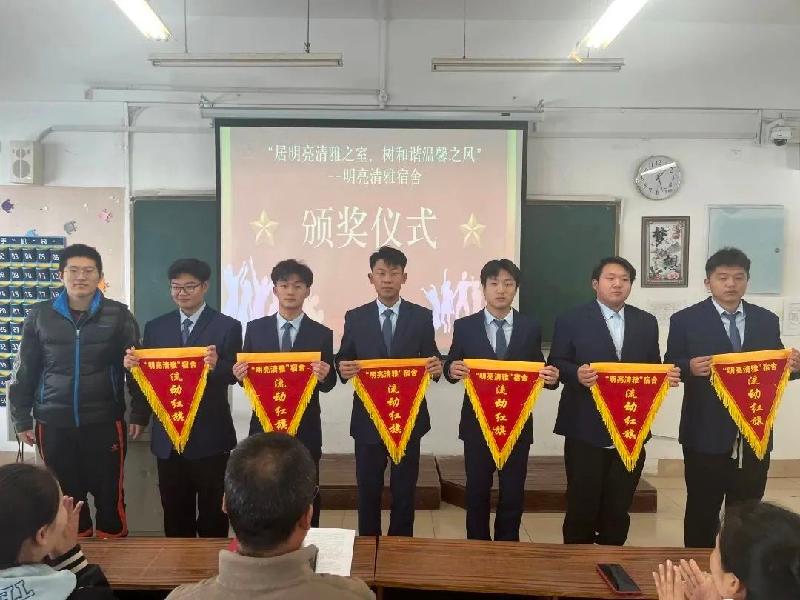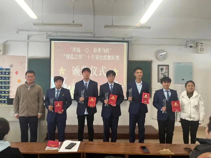 隨后系黨總支副書記岳衛(wèi)華、輔導(dǎo)員宋艷文為獲得“智造之星”十月量化優(yōu)勝班級榮譽(yù)的Z22001、Z22005、Z23008、Z23007、Z23003五個優(yōu)勝班級頒發(fā)獎杯、獎狀,輔導(dǎo)員趙偉照為獲得“明亮清雅”宿舍的4411、4338、4442、4114、4223、4230六個宿舍頒發(fā)流動紅旗。優(yōu)勝班級、優(yōu)秀宿舍代表相繼發(fā)言,分別介紹了建設(shè)良好班集體和明亮清雅宿舍的經(jīng)驗。