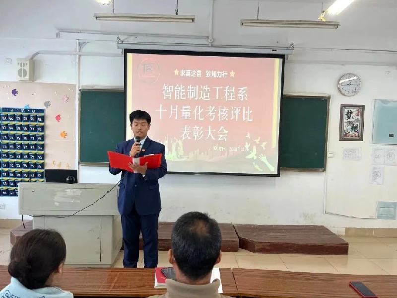 為表彰先進(jìn)典型,發(fā)揮榜樣示范引領(lǐng)作用,充分調(diào)動全班同學(xué)參與班級管理工作的積極性、主動性和創(chuàng)造性,使班級管理逐步趨于制度化、規(guī)范化、科學(xué)化,進(jìn)而不斷提高學(xué)生的整體素質(zhì)。通過檢查、評比,掀起一個“比、學(xué)、趕、幫、超”的熱潮。根據(jù)學(xué)院印發(fā)的《山東電子職業(yè)技術(shù)學(xué)院學(xué)風(fēng)建設(shè)行動方案》,結(jié)合我系實際,11月10日中午在3217教室舉辦“智能制造工程系10月份班級及團(tuán)支部量化考核總結(jié)表彰大會”。黨總支副書記岳衛(wèi)華、全體輔導(dǎo)員、班主任代表及22、23級學(xué)生代表參加大會。
