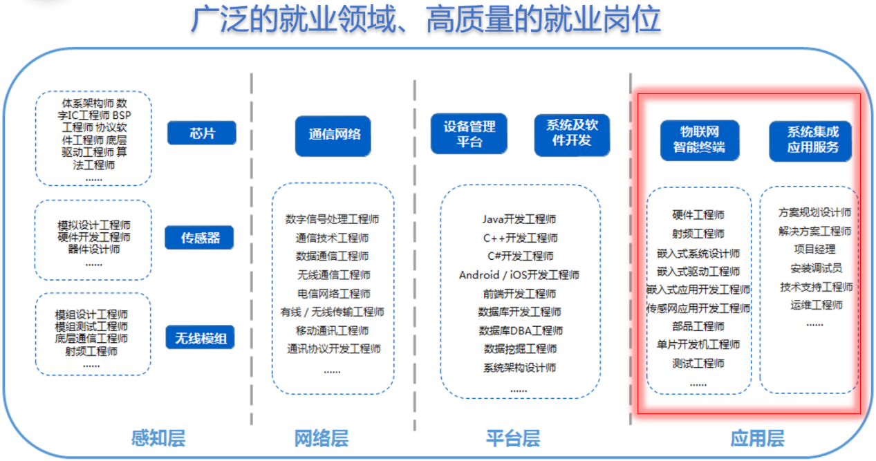 物聯(lián)網(wǎng)產(chǎn)業(yè)鏈主要包括:芯片、傳感器、無(wú)線模組、通信網(wǎng)絡(luò)、物聯(lián)網(wǎng)管理平臺(tái)、系統(tǒng)及軟件開(kāi)發(fā)、物聯(lián)網(wǎng)智能終端、系統(tǒng)集成及應(yīng)用服務(wù)。物聯(lián)網(wǎng)從業(yè)者備受青睞,未來(lái)五年人才需求缺口超過(guò)1600萬(wàn)人。面向物聯(lián)網(wǎng)應(yīng)用的就業(yè)崗位豐富,薪酬高,待遇好,前景廣闊。