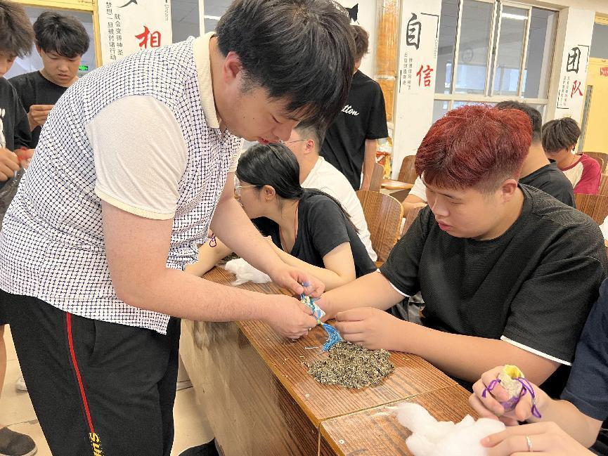 作為端午節(jié)的傳統(tǒng)配飾“香囊”它不僅蘊含著驅(qū)邪避瘟的美好寓意,更代表著人們對健康和平安的期盼。我院精心準備了各顏色布料、艾草以及裝飾配件等制作材料,為同學(xué)們搭建了一個展現(xiàn)創(chuàng)意和手工技巧的舞臺。活動現(xiàn)場氣氛熱烈而溫馨,艾草的清香與同學(xué)們的創(chuàng)作熱情相互交融,營造出了濃厚的節(jié)日氛圍。同學(xué)們?nèi)褙炞⒌刂谱鳎瑥牟眉舨剂系教畛湎懔希俚骄目p制,每一個步驟都體現(xiàn)出對傳統(tǒng)文化的尊重與傳承。