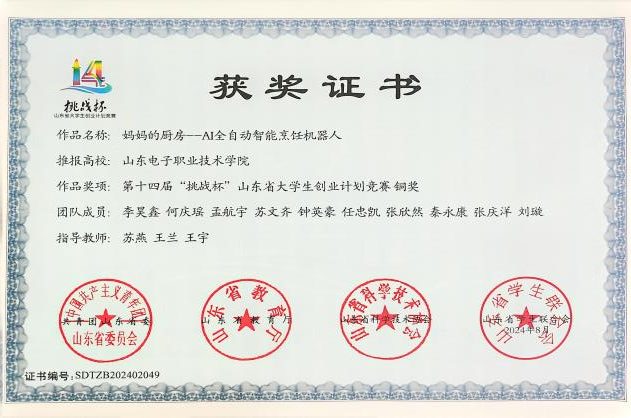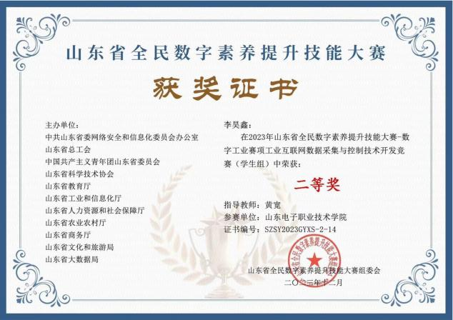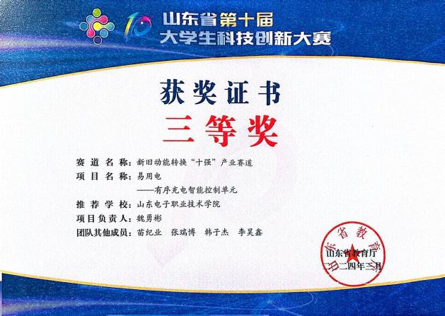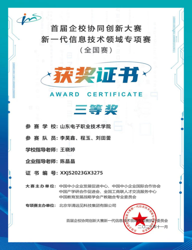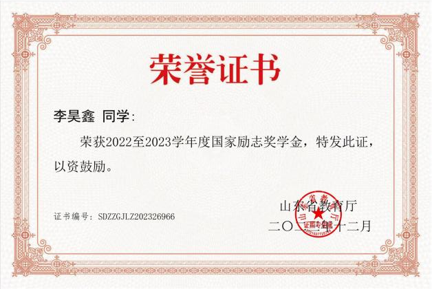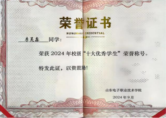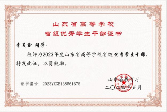 入學(xué)兩年來(lái),李昊鑫的學(xué)業(yè)成績(jī)和綜合測(cè)評(píng)均位列機(jī)電大類專業(yè)第一,在大一開(kāi)始就參加了山東大學(xué)工程管理專業(yè)自考本科,目前已通過(guò)了大部分科目,正在積極備考今年年底的2025考研。與此同時(shí),他十分注重創(chuàng)新能力與綜合素質(zhì)的全面提升,積極投身科創(chuàng)大賽備賽,通過(guò)大賽鍛煉實(shí)踐能力與創(chuàng)新思維,獲得了全國(guó)首屆企校協(xié)同創(chuàng)新大賽新一代信息技術(shù)領(lǐng)域?qū)m?xiàng)賽三等獎(jiǎng)、2024年“建行杯”山東省大學(xué)生創(chuàng)新大賽省級(jí)銀獎(jiǎng)等十項(xiàng)省級(jí)及以上榮譽(yù)。