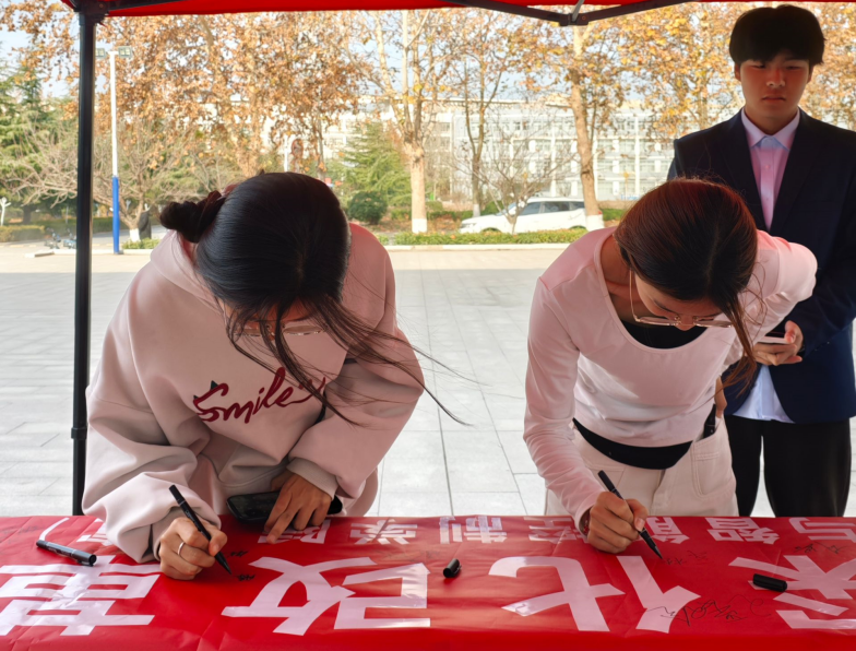 在活動現(xiàn)場,智造學子積極參與,在“大力弘揚憲法精神,推動進一步全面深化改革”的宣傳橫幅上簽下了自己的名字。這一刻,他們簽下的不僅是自己的名字,也是對憲法的承諾,每一個簽名都彰顯著同學們對憲法的堅實信仰。同學們紛紛表示,自己會堅定擁護憲法,以行踐諾,始終做憲法的忠實崇尚者、自覺遵守者、堅定捍衛(wèi)者。