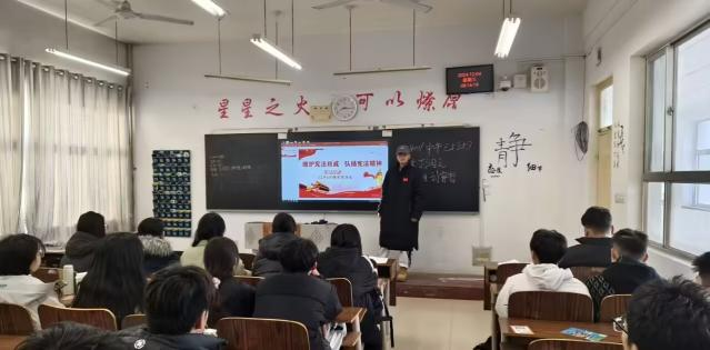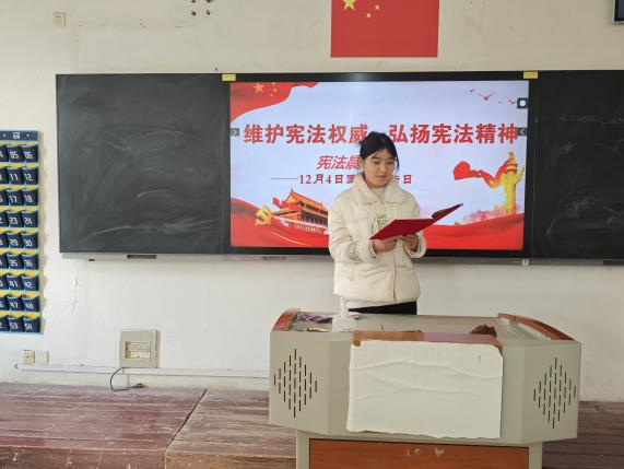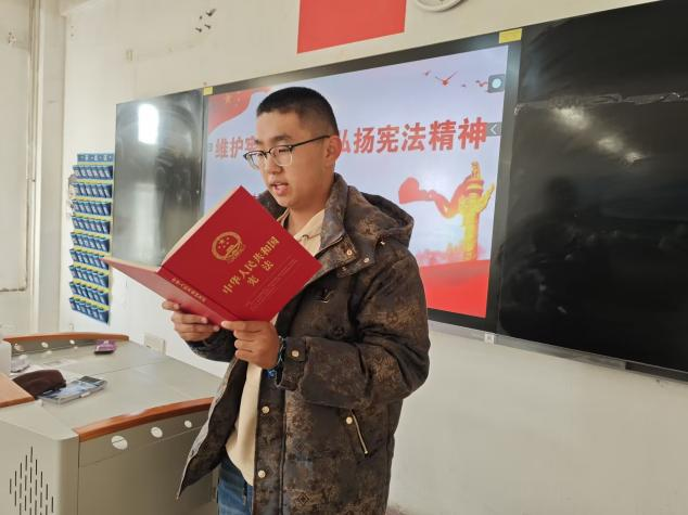 首先進行了憲法誦讀。教室里,同學們精神飽滿、神情專注,在領(lǐng)讀人的帶領(lǐng)下齊聲誦讀憲法條文內(nèi)容,誦讀聲聲聲入耳、鏗鏘有力,彰顯著青春的活力與激情。