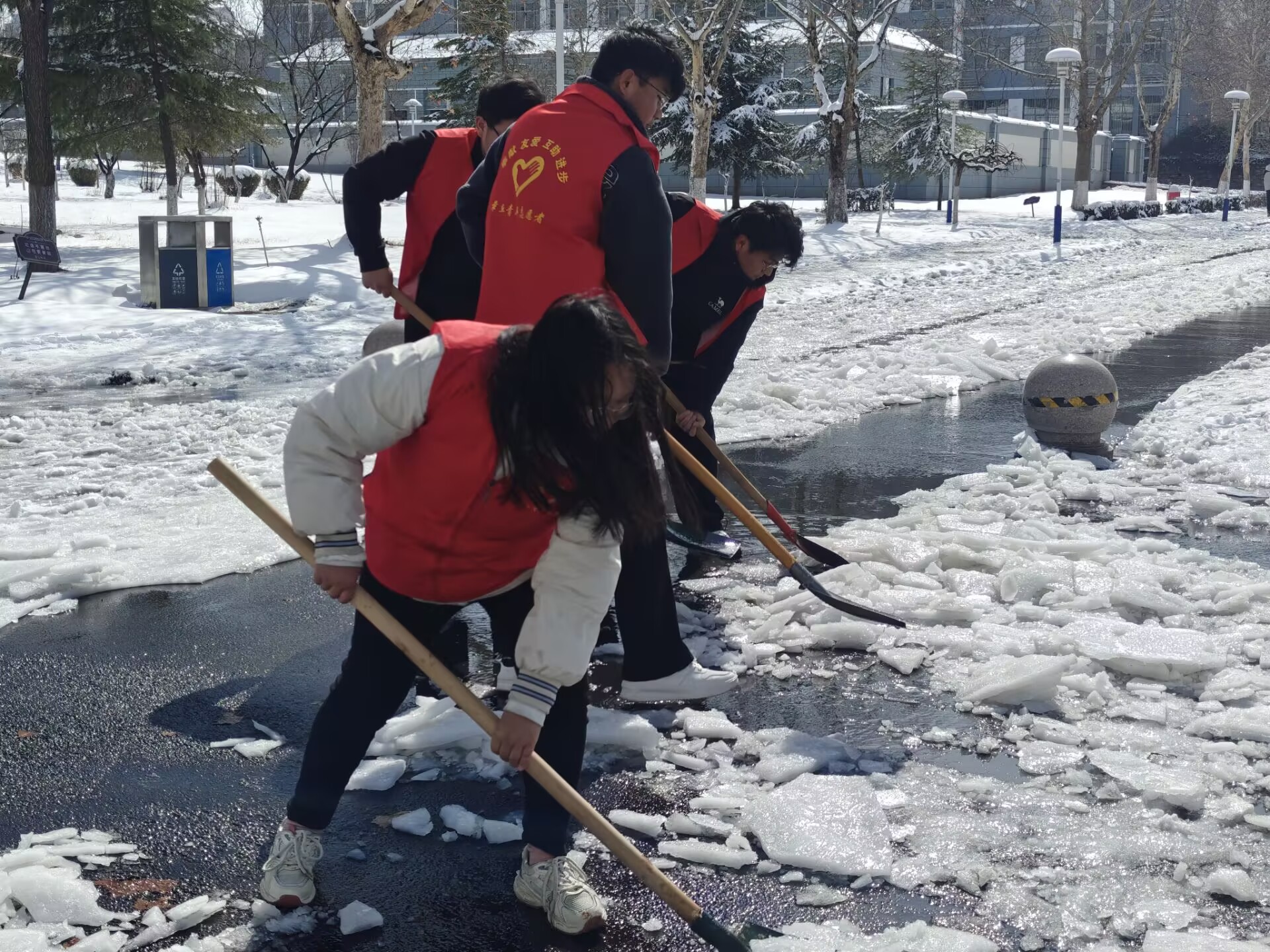 在大家的共同努力下,原本積雪皚皚、濕滑難行的主干道逐漸恢復(fù)了往日的整潔與通暢。此次掃雪除冰志愿服務(wù),不僅保障了校園道路的安全暢通,更展現(xiàn)了“智啟青春”服務(wù)隊(duì)的擔(dān)當(dāng)精神與青春風(fēng)采,他們用實(shí)際行動詮釋了“雷鋒月”奉獻(xiàn)的意義,為校園增添了一抹溫暖的亮色。