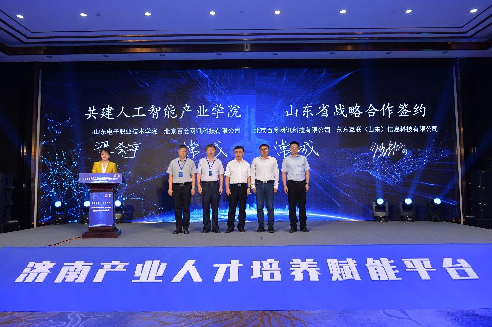 7月30日上午,共建濟(jì)南產(chǎn)業(yè)人才培養(yǎng)賦能平臺(tái)啟動(dòng)儀式在山東大廈舉行,我校與北京百度網(wǎng)訊科技有限公司共建人工智能產(chǎn)業(yè)學(xué)院簽約儀式同期進(jìn)行。省工信廳副廳長王新生、濟(jì)南市副市長孫斌等領(lǐng)導(dǎo)出席啟動(dòng)儀式,我校黨委副書記遲會(huì)禮,副院長梁會(huì)亭與北京百度網(wǎng)訊科技有限公司就共建人工智能產(chǎn)業(yè)學(xué)院事宜簽署了合作協(xié)議。