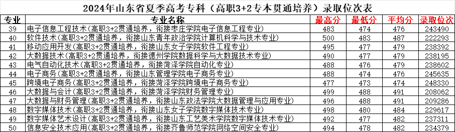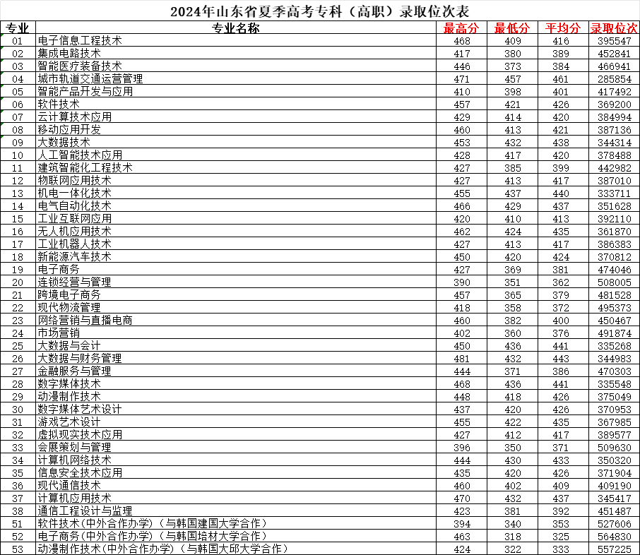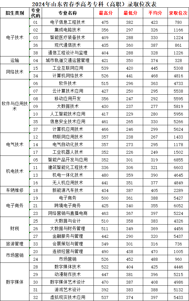 山東電子職業(yè)技術(shù)學(xué)院2024年面向7個省(自治區(qū))招生,總招生計劃4701人,其中三年制高職招生計劃4150人,三二連讀轉(zhuǎn)段招生計劃551人,各類別招生錄取率100%,招生情況總體穩(wěn)中有升,生源質(zhì)量持續(xù)向好。2024年,該校夏季高考“3+2”專本貫通招生專業(yè)12個,招生計劃520人,為全省最多;夏季高考一段線上人數(shù)為594人,占夏季高考招生計劃比例26.08%,400分及以上考生1550人,占夏季高考招生計劃68.04%。2024年,學(xué)校在省內(nèi)普通類專科最低投檔位次,省內(nèi)公辦同類院校第(56所)13位,省內(nèi)公辦專科院校(68所)第20位。2024年學(xué)校夏季高考分專業(yè)錄取在全省同類院校中排名第一的專業(yè)有9個,位居全省第3位。