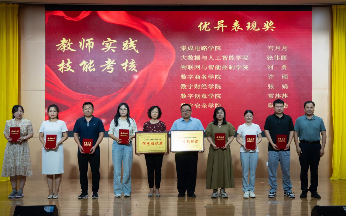 在歷時兩個月的專業(yè)教師實踐技能考核工作中,集成電路學院與數(shù)字商務學院憑借精細化組織管理與顯著改革成效脫穎而出,榮獲“優(yōu)秀組織獎”,集成電路學院院長郭隆健、數(shù)字商務學院院長李敏上臺分享了本次活動的組織經(jīng)驗與心得體會,為全校“雙師型”隊伍建設提供了可復制的改革范式。來自各二級學院的7位教師在實操考核中展現(xiàn)出過硬的專業(yè)技能,榮獲“優(yōu)異表現(xiàn)獎”。張建臣為表現(xiàn)優(yōu)異的2個學院及7位優(yōu)秀教師代表頒獎。