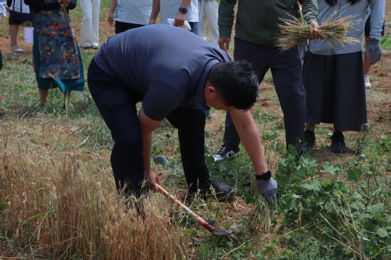 我系黨總支書記岳衛(wèi)華在主持中為師生普及芒種及“三夏”知識(shí),呼吁大家在這個(gè)豐收的時(shí)節(jié),拿起工具忙碌起來(lái),共同體驗(yàn)勞動(dòng)的美德,體會(huì)收獲的喜悅。現(xiàn)場(chǎng)展示傳統(tǒng)手工割麥操作規(guī)范,講解勞動(dòng)安全防范。柏一星在講述自己曾經(jīng)五年鄉(xiāng)鎮(zhèn)工作及親身參加農(nóng)事的經(jīng)歷,講解有關(guān)小麥的知識(shí)故事,并隆重宣布“開(kāi)鐮”,激勵(lì)大家在這片沃土上以勞動(dòng)開(kāi)啟智慧與收獲。